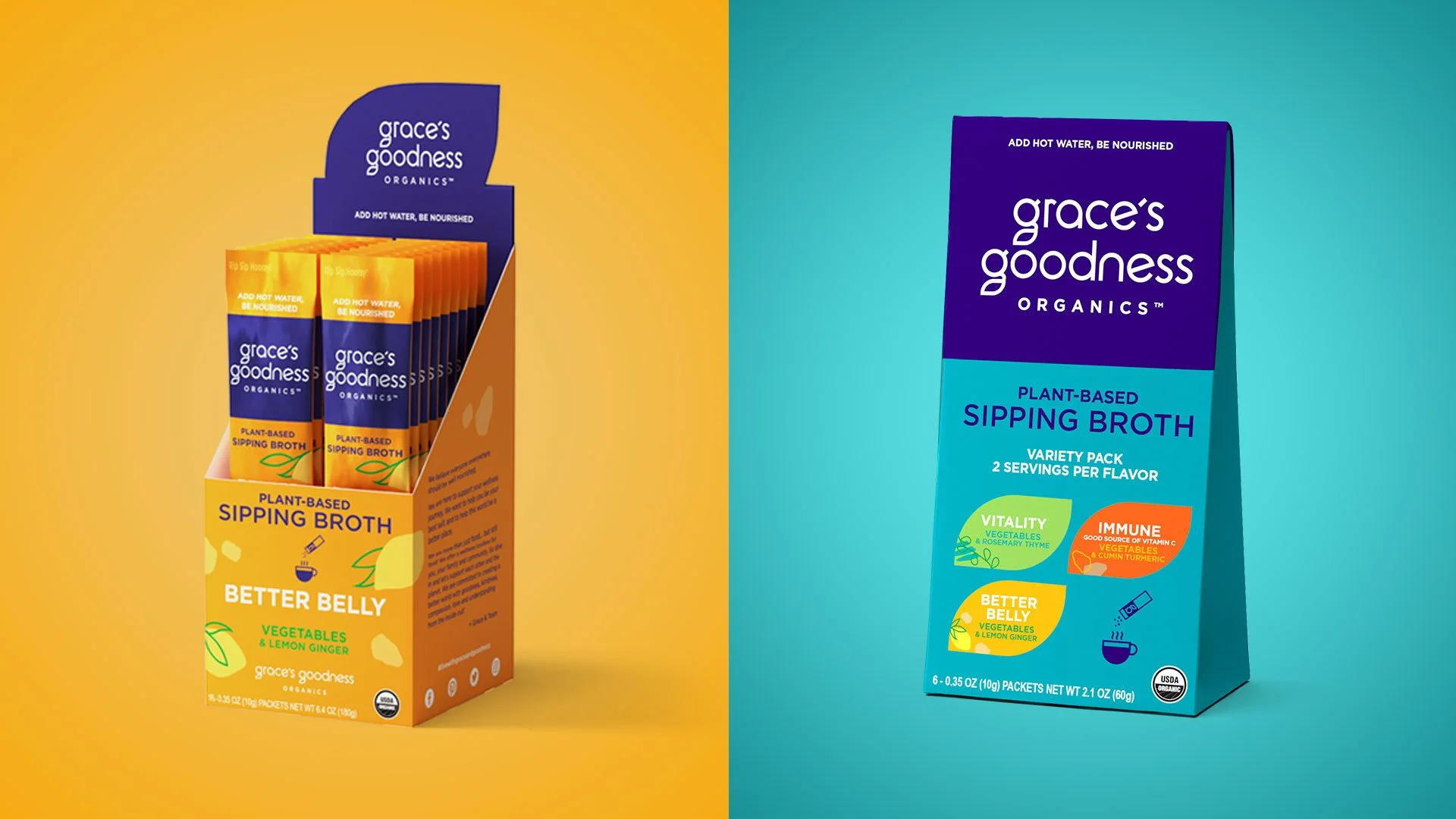 Grace’s Goodness, originally launched as Beyond Broth, needed a clear and differentiated position within the natural foods category. I partnered closely with the founder and leadership to rename and reposition the brand, creating a modern, approachable identity built for today’s on-the-go consumer.
